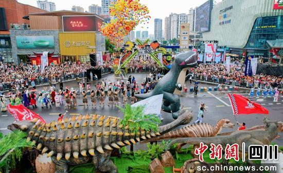 據(jù)悉,本次活動的6大主題方陣包括恐龍方陣、美食方陣、漢服方陣及四川省城市足球聯(lián)賽的球迷方陣等。6大方陣沿著巡游路線緩慢經(jīng)過,并與觀眾近距離互動,吸引了數(shù)千觀眾駐足觀看。(劉剛/文 自貢市委宣傳部 供圖)