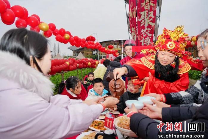 來自武侯區(qū)的周先生一家人說,他們特意預(yù)定了席位,就是為了來吃一頓正宗的壩壩宴:“在千畝田園里吃非遺壩壩宴,既有儀式感又接地氣,黃辣丁是現(xiàn)撈現(xiàn)做的,這才是新津的新年專屬味道。”