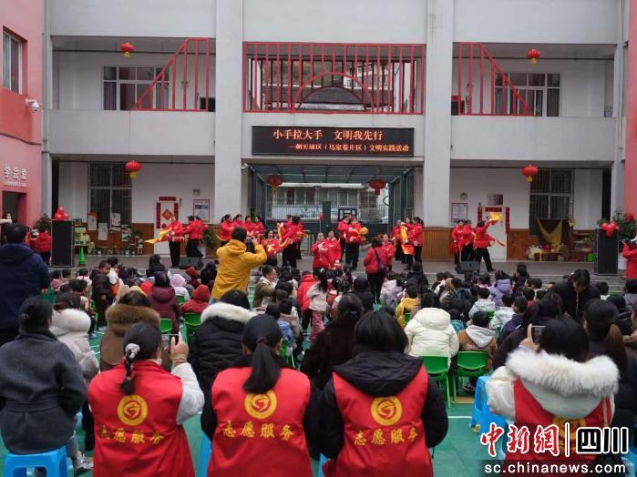 中新網(wǎng)四川新聞1月20日電 (冉金鷺)“咚咚鏘!咚咚鏘!”1月20日,廣元市朝天區(qū)大豪博愛幼兒園內(nèi)鼓聲陣陣、笑語盈盈,社區(qū)腰鼓隊的隊員們身著喜慶服飾,踏著歡快節(jié)拍舞動身姿,清脆的腰鼓聲不僅敲出了辭舊迎新的熱鬧氛圍,同時拉開了“小手拉大手文明我先行”朝天城區(qū)(馬家巷片區(qū))文明實踐活動的序幕,片區(qū)居民與幼兒園師生代表齊聚一堂,在歡聲笑語中解鎖文明密碼,在互動體驗中傳遞向善力量。