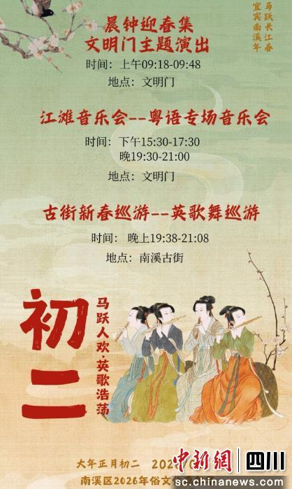 正月初三(2026年2月19日)9時(shí)18分-9時(shí)48分,在文明門(mén)舉行晨鐘迎春主題演出;15時(shí)30分-17時(shí)30分舉行江灘音樂(lè)會(huì)一一假面搖滾音樂(lè)會(huì);19時(shí)38分-21時(shí)08分在南溪古街舉行古街新春巡游一一動(dòng)漫雜耍巡游。