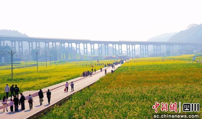 據(jù)悉,相較于往年,今年的賞花季活動(dòng)在景觀打造與體驗(yàn)設(shè)計(jì)上更具創(chuàng)意與特色。景觀層面,園區(qū)通過不同品類、不同色澤油菜的搭配種植,從高空俯瞰,勾勒出“馬到成功”“巨型福袋”“高縣土火鍋”等栩栩如生的花田造型,兼具觀賞性與文化感,構(gòu)成一幅幅立體鮮活的田園畫卷,為游客帶來沉浸式觀賞體驗(yàn)。同時(shí),園區(qū)配套設(shè)施全面升級(jí),蜿蜒的彩虹步道穿梭花海,新增觀景平臺(tái)可供登高遠(yuǎn)眺,將金色花海與周邊青山、民居的田園美景盡收眼底,37個(gè)文旅節(jié)點(diǎn)同步完善,讓賞景之路步步皆驚喜。