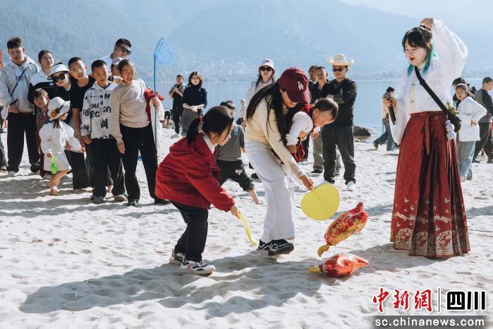 當(dāng)日下午2時(shí)許,暖陽(yáng)下的金粼沙灘游人如織。一陣熟悉的旋律突然響起,幾位“隱藏”在人群中的歌手唱響《恭喜發(fā)財(cái)》《好運(yùn)來(lái)》等新春歌曲,迅速吸引了所有人的目光。來(lái)自重慶的游客張女士驚喜地表示:“一開(kāi)始還以為是游客自發(fā)唱歌,沒(méi)想到人越聚越多,原來(lái)是一場(chǎng)精心策劃的快閃!”演員們一邊演唱,一邊向周圍游客派發(fā)新春小風(fēng)車和福字貼圖,現(xiàn)場(chǎng)氣氛瞬間被點(diǎn)燃。在主持人的帶領(lǐng)下,上百名游客面朝邛海,齊聲高喊“新年快樂(lè)”,吶喊聲在湖面上久久回蕩。