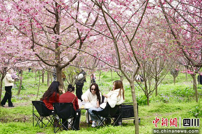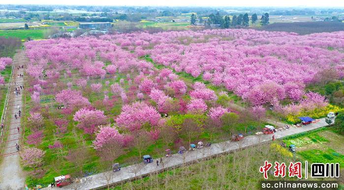 位于九龍鎮(zhèn)雙泉村的“龍門飛櫻”櫻花林,400畝櫻花正值盛放期。成片櫻花交織成絢爛花海,水紅與粉白層層鋪展,遠(yuǎn)望如霞似霧。微風(fēng)拂過,花瓣紛揚(yáng)如雪,灑下一場(chǎng)春日“花雨”。游客們漫步花海拍照打卡、靜坐沐春,孩童嬉笑追逐,處處滿是春日愜意與生機(jī)。“我陪家人從西安來綿竹旅游,這里的櫻花太美了,春天的氣息很濃郁,讓人心情格外舒暢!庇慰陀嗾礁袊@道。