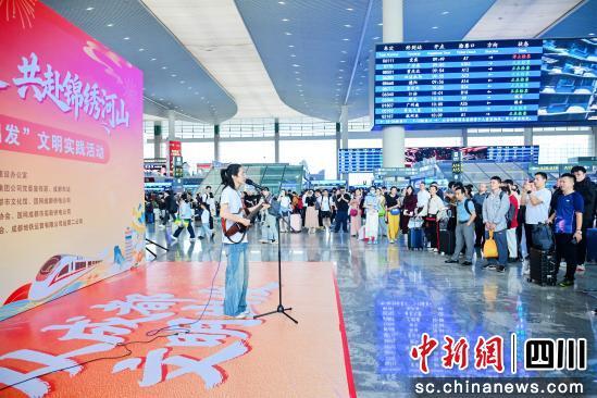 假期前的成都東站,人潮如織,行李箱滾輪聲、談話聲此起彼伏。就在這時(shí),歌曲《成都》熟悉的旋律突然響起,瞬間吸引了人們的目光。領(lǐng)唱的成都街頭藝人揮手示意,百人合唱隊(duì)從人群中站起,聲音逐漸匯聚成氣勢磅礴的合唱。