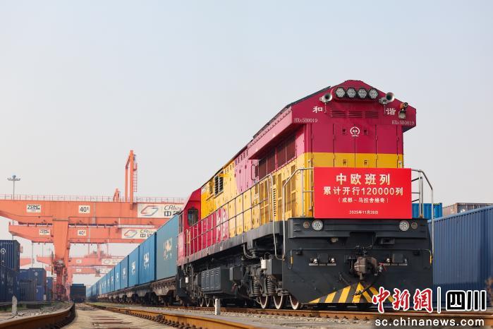 中新網(wǎng)四川新聞12月2日電。▍庆o 白桂斌)近日,裝載紅油面皮、火鍋底料等四川特色食品和拼多多跨境電商商品的X8086次中歐班列從成都國際鐵路港發(fā)出,開往波蘭馬拉舍維奇,最終將分撥至德國杜伊斯堡、法國里昂、比利時安特衛(wèi)普等歐洲核心城市。這標志著中歐班列累計開行量突破12萬列。