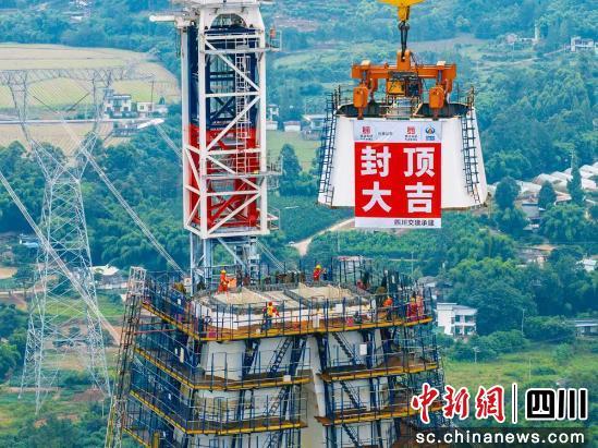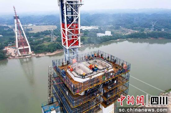 中新網(wǎng)四川新聞10月7日電。ㄓ浾摺⒅铱。10月6日,四川天府新區(qū)經(jīng)眉山至樂(lè)山高速公路(簡(jiǎn)稱“天眉樂(lè)高速”)控制性工程——虎渡溪岷江特大橋主塔順利封頂,項(xiàng)目即將進(jìn)入梁板安裝階段。