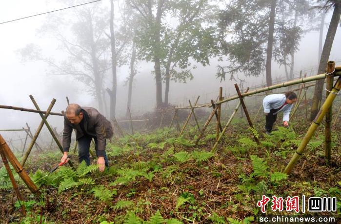 黃家院村金銀花種植園,位于該村山頂,雨后的種植園薄霧朦朧中,空氣清新,園區(qū)內(nèi)竹木搭建的金銀花生長架沿著山勢排列整齊,已經(jīng)栽種好的金銀花苗茁壯生長,負(fù)責(zé)田間管理的村民正在除草、施肥,為金銀花苗生長提供良好環(huán)境!拔覀冊谕恋仄秸煤缶驮谶@里栽種花苗,現(xiàn)在苗子全部栽好,田間道路,花架子這些配套也弄完了,不少花苗都長起來了!痹邳S家院村金銀花種植園里,村民陳明富和愛人正在園區(qū)內(nèi)除草,他介紹自從集體項(xiàng)目建設(shè)以來,他和村里30多名留守村民、脫貧戶優(yōu)先在這里務(wù)工,每天不僅有160元收入,同時大家還學(xué)會了苗木管護(hù)技巧,為下一步自己種植也打下基礎(chǔ)。