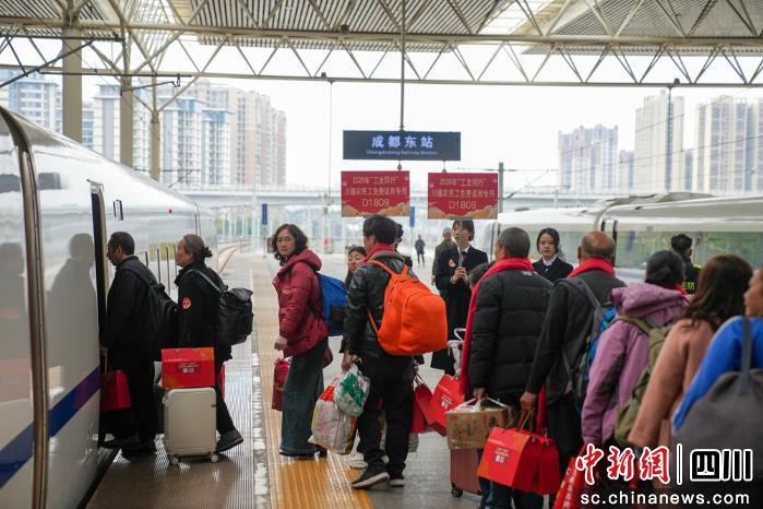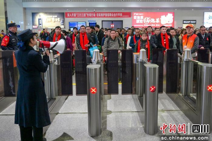 成都東站候車大廳內(nèi),鐵路部門(mén)為務(wù)工人員開(kāi)設(shè)綠色通道,大家有序候車、檢票,現(xiàn)場(chǎng)秩序井然。站臺(tái)上,隨著列車一聲?shū)Q笛,這列滿載著家鄉(xiāng)囑托與務(wù)工人員希望的專列緩緩啟動(dòng),一路向南奔赴廣東,正式開(kāi)啟新一年的打拼之旅!斑@趟專列共搭載760余名川籍務(wù)工人員,我們提前摸排客流信息,從候車、檢票到乘車全程提供貼心服務(wù),全力保障務(wù)工人員平安順利出行。”成都東站客運(yùn)科科長(zhǎng)鄢鷗介紹。