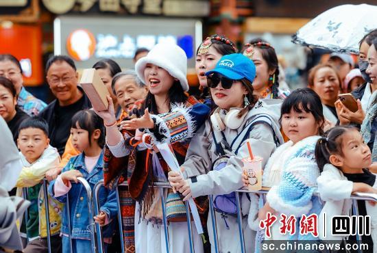 同時(shí),6對(duì)經(jīng)典熒幕情侶Coser的快閃表演成為街頭“流動(dòng)風(fēng)景線(xiàn)”。在沙洋行,演員化身“金路易”與“仁欽拉姆”,搭配西洋樂(lè)與藏式踢踏舞,還原1919年康定多元文化交融場(chǎng)景;溜溜城入口處,“文成公主”與“松贊干布”互贈(zèng)信物,生動(dòng)詮釋漢藏情誼;將軍橋“牛郎織女”身著漢服派送玫瑰,營(yíng)造浪漫氛圍;瑪吉阿米門(mén)口,“張大哥”“李大姐”領(lǐng)唱《溜溜調(diào)》,邀請(qǐng)路人接唱;彩虹橋畔,戲曲版《梁!方(jīng)典唱段引得游客跟唱;格;◤V場(chǎng)上,康定城市IP“尕尕卓卓”人偶穿梭派發(fā)玫瑰,儀式感拉滿(mǎn)。