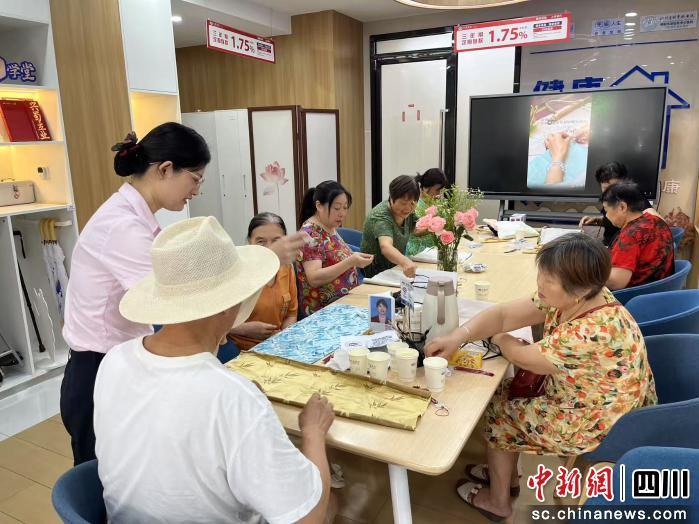 在綿陽(yáng)分行長(zhǎng)虹世紀(jì)城社區(qū)支行網(wǎng)點(diǎn)里,她和同事們常年組織老年朋友們體驗(yàn)非遺手工、中藥手作等,在靜謐時(shí)光中讓大家更好感受中國(guó)傳統(tǒng)文化滋養(yǎng)。曹鑫回憶道:“隔壁軍屬社區(qū)的王阿姨,網(wǎng)點(diǎn)安愉課堂一節(jié)不落,每天早上送完孫子去學(xué)校,就馬不停蹄來(lái)我們這邊參加活動(dòng)!痹诮衲8月開展的主編工藝課程上,王阿姨認(rèn)真瞇著眼睛認(rèn)真聽講,動(dòng)手實(shí)踐時(shí)專心致志,拉著手工老師問(wèn)問(wèn)題。課程結(jié)束后,王阿姨興奮地舉起自己做的竹節(jié)包說(shuō):“提著這個(gè)包包裝點(diǎn)零食和水杯去打麻將,安逸!”
