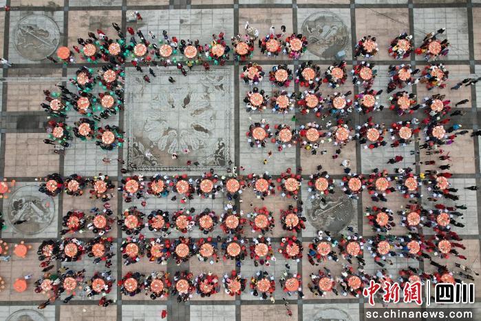 在景區(qū)八仙廣場(chǎng),擺放容納千余人座位的圓桌,更是增添了節(jié)日氣氛。大家齊聚一堂,一邊觀看著川劇變臉、美猴王、小魔術(shù)等本地民俗節(jié)目,一邊吃著壩壩宴品嘗舌尖上的美味,共話美好未來(lái)。