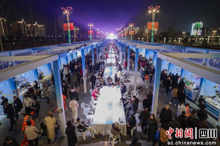 夜幕降臨,營(yíng)山縣文運(yùn)路化身美食的海洋,燈光璀璨、人聲鼎沸。150米“長(zhǎng)桌宴”沿街一字鋪開,一個(gè)個(gè)餐位座無虛席,慢火熬煮的羊湯湯色奶白、鮮醇濃厚,炭火烤制的羊排外皮焦脆、內(nèi)里鮮嫩,還有羊肉串、粉蒸羊肉等美食輪番登場(chǎng),各種美食的香氣交織在一起,彌漫在城市夜空,刺激著人們的味蕾。