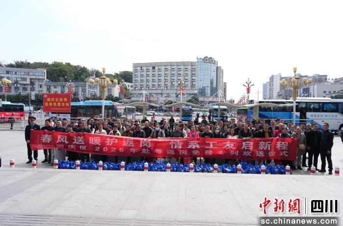 中新網四川新聞2月27日電 (何佳林)“陳德茂、趙友強、任勝茂……都到齊了嗎?準備集合領物資啦!”2月26日13時整,順慶區(qū)2026年赴粵返崗免費專列歡送儀式在南充市火車站舉行,118名乘坐K488次列車的返崗工友,帶著家鄉(xiāng)的祝福與期盼,踏上前往廣東的復工之旅。