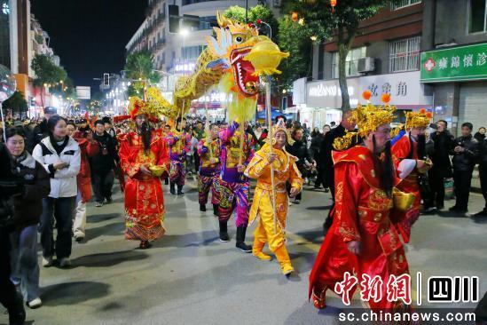 夜幕下,平武風情大型巡游隆重上演,鑼鼓隊、曹蓋隊、民族隊、牦牛隊、熒光舞獅隊、舞龍隊等組成的巡游隊伍載歌載舞,市民游客自發(fā)加入,形成萬人共慶的盛景!疤珶狒[了,這才叫過年!”來自成都的游客周先生高興地說,活動非常豐富,在感受本地民俗文化中過年,很有意義。