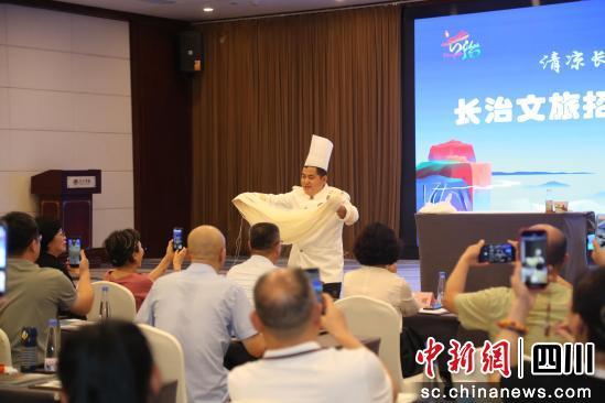 活動現(xiàn)場還舉行了精品項目戰(zhàn)略合作及旅行社合作協(xié)議簽約儀式,為長治成都兩地文旅協(xié)同發(fā)展奠定基礎。活動中穿插多個文藝表演,包括歌伴舞《去一個叫長治的地方》《千里太行第一峽》、上黨落子《徐策跑城》和長子鼓書《山西面食》等,展現(xiàn)出濃郁的地方文化特色,贏得現(xiàn)場陣陣掌聲。八泉峽、武鄉(xiāng)紅色旅游景區(qū)等也分別作了專題推介,進一步加深觀眾對長治文旅資源的認知。面食表演成為全場亮點,獨輪車刀削面、千絲拉面、面團吹氣球等絕活令觀眾連連稱贊。