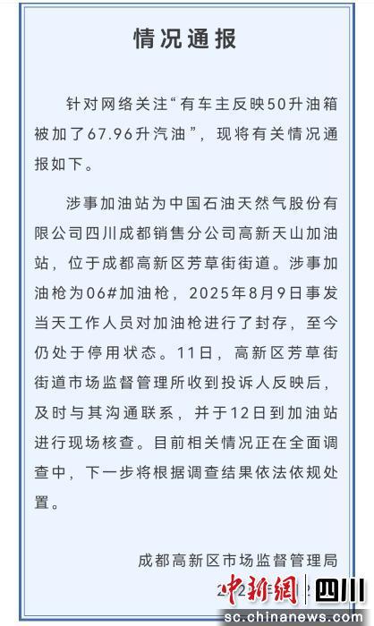 中新網(wǎng)四川新聞8月21日電 (記者 劉忠俊)8月21日,成都高新區(qū)市場監(jiān)督管理局針對網(wǎng)絡(luò)關(guān)注的“50升油箱加出67.96升油”情況發(fā)布通報稱,相關(guān)情況正在調(diào)查中,將根據(jù)調(diào)查結(jié)果依法依規(guī)處置。