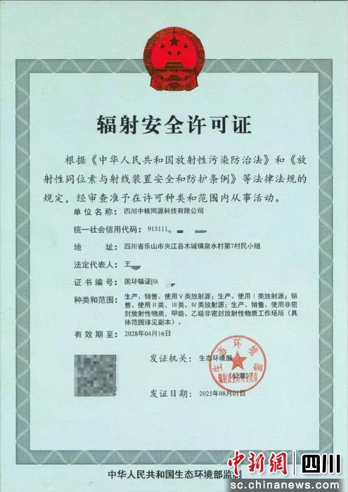 中新網四川新聞8月25日電 (劉忠俊 鄒勇智)近日,位于四川樂山夾江縣境內的四川中核同源科技有限公司(以下簡稱“中核同源”)的放射源研發(fā)生產基地,成功取得由生態(tài)環(huán)境部頒發(fā)的甲級輻射安全許可證,正式具備放射源生產、銷售等資質。