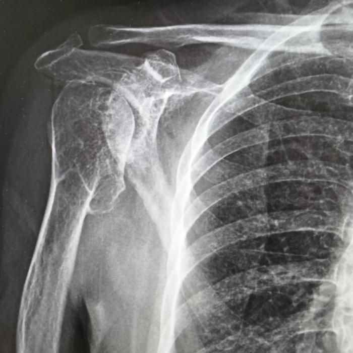 在成都市第三人民醫(yī)院評(píng)估后明確診斷為右肩關(guān)節(jié)重度骨性關(guān)節(jié)炎伴肩袖損傷?紤]其關(guān)節(jié)結(jié)構(gòu)破壞重、功能需求高,團(tuán)隊(duì)為其制定反式人工肩關(guān)節(jié)置換方案。