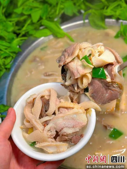 仙山麻羊是葛仙山鎮(zhèn)井泉村的“拳頭產(chǎn)品”。“這是有‘背景’的羊。喝山泉水、吃百草長大,肉質(zhì)本身就鮮美細(xì)嫩,脂肪和膽固醇含量少,但蛋白質(zhì)和微量元素豐富。當(dāng)?shù)厝苏f‘冬至一碗羊肉湯,一個(gè)冬天都不冷’,講的就是它!本宓谝粫浲翡h推介道。連續(xù)三年舉辦的“冬享暖羊”養(yǎng)生購山貨帶火了井泉村,八方游客紛至沓來品羊肉湯、嘗烤全羊。作為仙山麻羊的主產(chǎn)地,井泉村也走出了一條鄉(xiāng)村振興“羊”光大道,集體經(jīng)濟(jì)收入實(shí)現(xiàn)較大提升。今年,井泉村集體經(jīng)濟(jì)合作社與彭州當(dāng)?shù)貒蟪啥间战t(yī)教健康服務(wù)有限公司合作開發(fā)“二十四方·仙山藥膳禮盒”,進(jìn)一步延伸了仙山羊肉湯的客戶半徑——通過“仙山優(yōu)品”小程序購買,不到葛仙山也能喝到正宗仙山味道。