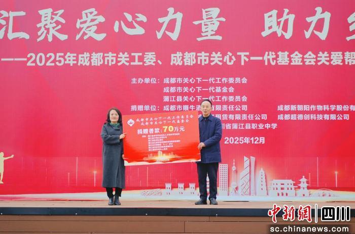 中新網(wǎng)四川新聞12月30日電 12月30日,成都市關(guān)工委、成都市關(guān)心下一代基金會聯(lián)合蒲江縣關(guān)工委,攜手成都市順牛酒業(yè)有限責(zé)任公司、成都新朝陽作物科學(xué)股份有限公司、四川藍(lán)恒機械設(shè)備租賃有限責(zé)任公司、成都超德創(chuàng)科技有限公司、成郁市浦議食品有限公司等愛心企業(yè),在蒲江縣職業(yè)中學(xué)共同舉辦“匯聚關(guān)愛 力量助力鄉(xiāng)村振興”公益捐贈活動。