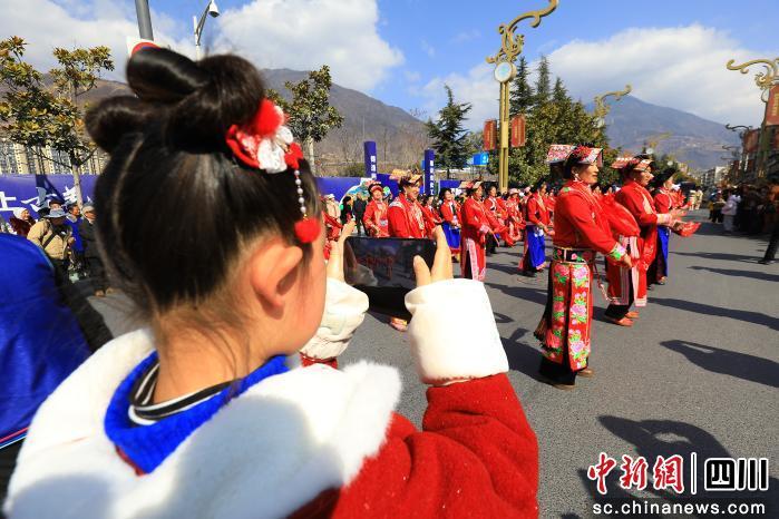 中新網(wǎng)四川新聞2月18日電 18日,四川省阿壩州茂縣舉行“羌山躍馬賀歲 祥龍瑞獅送!贝蟀菽昊顒(dòng),18支隊(duì)伍沿縣城主要街道一路歡歌起舞,以獨(dú)具羌鄉(xiāng)特色的非遺及民俗展演,為全縣群眾和八方游客送上新春祝福,讓整座羌城沉浸在歡樂(lè)祥和的節(jié)日氛圍中。