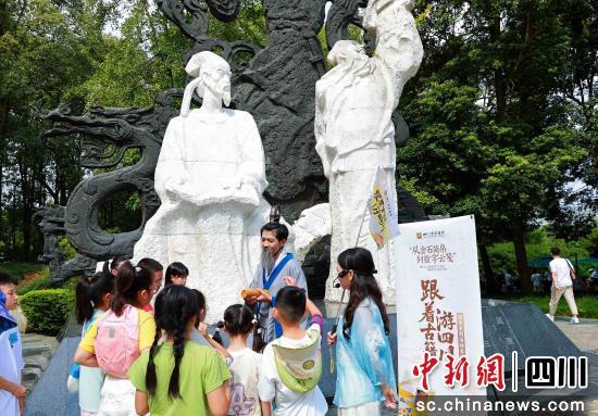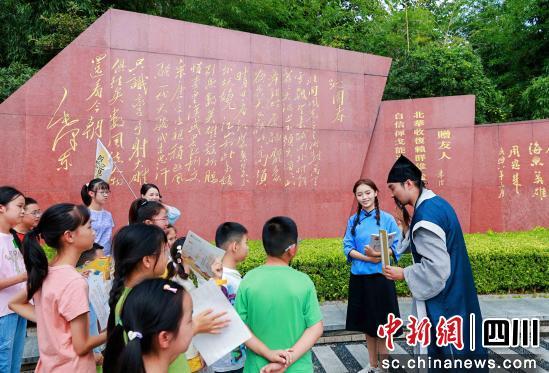 帶隊老師在浣花溪詩歌大道為讀者講解。四川省圖書館供圖