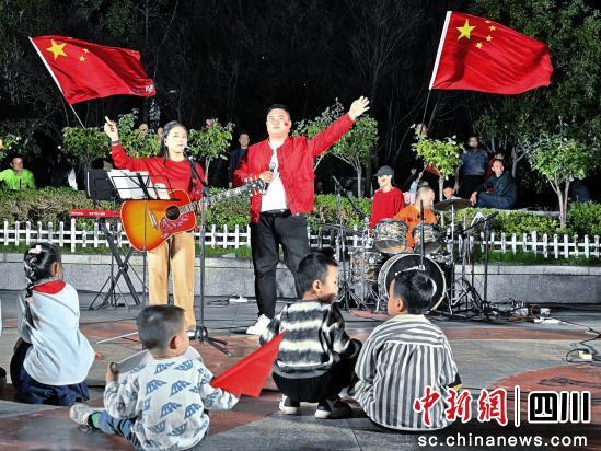 中新網(wǎng)四川新聞9月30日電。ㄔ拢斑!咚!咚!……”29日傍晚,廣元市朝天區(qū)大中壩廣場的夜空被清脆的手鼓聲打破。舞臺上,幾位身著紅色衛(wèi)衣的表演者輕擊手鼓,伴著悠揚(yáng)笛聲,緩緩唱響《紅山果》。臺下,一群手舉小紅旗的兒童踩著節(jié)拍蹦跳歡呼,一場融合情景表演與多元藝術(shù)的群眾文化展演在璀璨燈火中拉開帷幕。