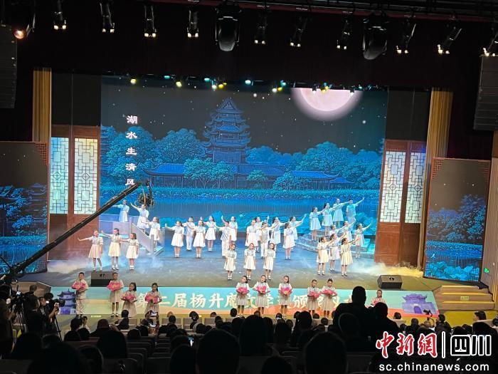 不同于傳統(tǒng)頒獎儀式,本次頒獎以四幕舞臺劇串聯(lián)起楊升庵的人生軌跡與精神脈絡(luò),成為全場亮點。從《少年風(fēng)華》開篇中24歲高中狀元、胸懷天下的青年才俊到《苦樂相隨》篇章里被貶云南、與夫人黃峨依依惜別的深情志士,再到《蜀云滇月》中在邊陲編書繪圖、促進(jìn)民族融合的文人典范,最后以《夢歸新都》中70余歲仍心念故土的老者形象落幕,演員們用細(xì)膩的演繹,將楊升庵“臨利不敢先人,見義不敢后身”的人格操守與“文以載道,情以寄鄉(xiāng)”的文化情懷展現(xiàn)得淋漓盡致。此外,新都區(qū)繁江小學(xué)學(xué)生帶來的川劇戲歌《桂湖寄思》,以童聲演繹楊升庵詩詞,讓傳統(tǒng)文化在年輕一代中煥發(fā)新生。
