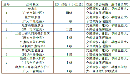 未來一周較適宜觀賞紅葉的景點,主要分布在我省東北部曾家山、鹽井河峽谷、光霧山景區(qū)。此外,今年受閏月和氣候等因素影響,紅葉觀賞期較往年預(yù)計推遲10~15天。省林草旅游中心提醒,紅葉宜晴朗天氣觀賞,大部分景區(qū)溫差較大,需做好保暖措施,山路曲折,注意出行安全。