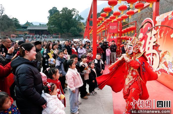 川劇變臉與雜技表演輪番上演,瞬息萬變的臉譜與驚險(xiǎn)刺激的技藝贏得陣陣喝彩。廣場一側(cè)的“生肖賜!ゑR上轉(zhuǎn)運(yùn)”生肖大轉(zhuǎn)盤互動(dòng)游戲更是笑聲不斷,游客轉(zhuǎn)動(dòng)轉(zhuǎn)盤贏取新年福運(yùn)。