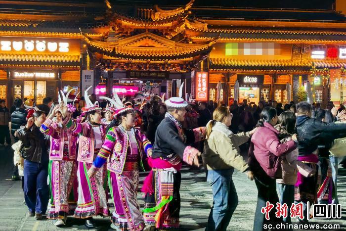 夜幕降臨,平武的年味在燈光與歌舞中愈發(fā)濃厚。在西城報(bào)恩里商業(yè)街區(qū),莊嚴(yán)的“晨鐘暮鼓”開閉城儀式為節(jié)日增添了儀式感。夜色漸深之際,“藏羌風(fēng)韻”民族快閃在街頭驟然響起,熱情的藏羌兒女帶領(lǐng)游客踏歌共舞;緊接著,“龍州印象”燈光秀以現(xiàn)代光影技術(shù)點(diǎn)亮山城夜空,為八方游客帶來視聽雙重震撼。
