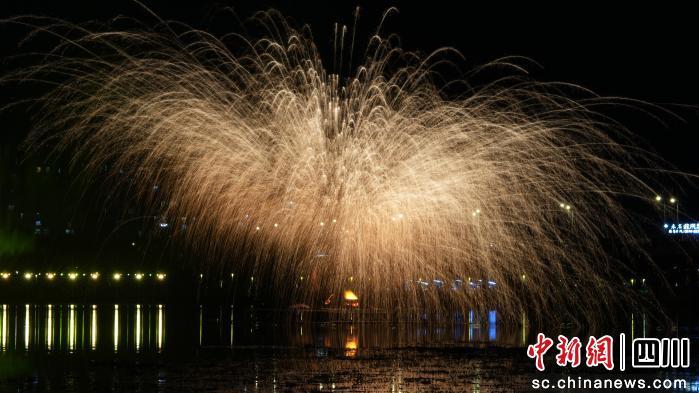 作為夜間盛典的預熱高潮,非遺打鐵花表演在臨水區(qū)域震撼上演。高溫鐵水被擊打至空中,瞬間迸發(fā)出萬顆流星般的璀璨火花,呈現(xiàn)出“火樹銀花不夜天”的壯麗景象;與此同時,無人機群同步升空,以夜空為幕布,拼出各類圖案,與旌湖湖面倒影交相輝映,現(xiàn)場觀眾紛紛舉起手機記錄這一震撼瞬間。