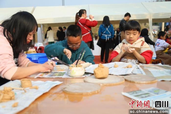 除了舌尖上的享受,展區(qū)內(nèi)還設(shè)置了非遺手作體驗區(qū)。陶藝展區(qū)不僅陳列著精美的陶藝作品,更有非遺人現(xiàn)場演示拉坯、修坯等制作工藝,不少學(xué)生躍躍欲試,在老師指導(dǎo)下親手捏制陶藝作品,沉浸式感受南溪非遺的魅力。
