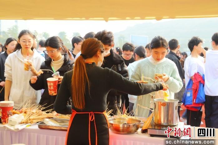 展區(qū)內(nèi),南溪特色美食集中亮相,香氣四溢、人氣高漲。娥天歌鵝肉干醇香有嚼勁,小黃粑軟糯香甜,銀絲卷松軟細膩,獼猴桃鮮甜多汁……一道道地道風(fēng)味輪番登場,吸引眾多學(xué)生排隊試吃、爭相購買。